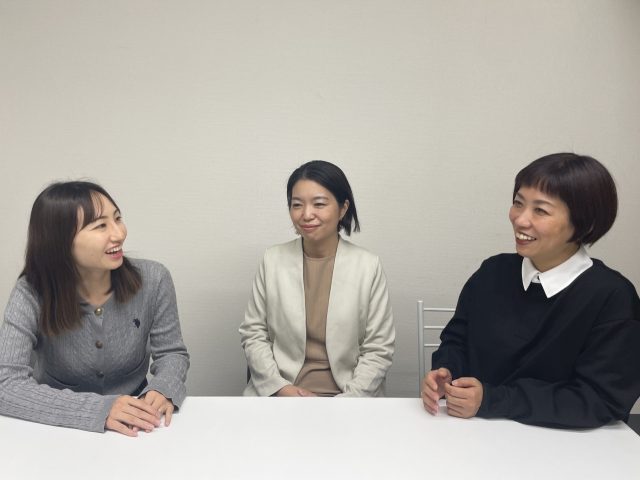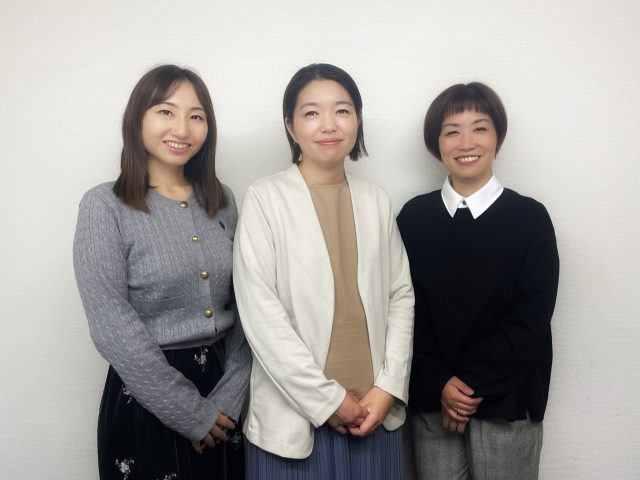 小川 絢子(写真中央):学生時代に環境NGOに参加。卒業後は自然保護団体に10年間勤めNPO・行政の協働事業サポート、助成金事務局を経験。その後、公設の市民交流施設で協働コーディネーター、社会福祉協議会で民生委員・児童委員向け研修の運営、並行して教育NPOでのペアレントメンター活動を経て、2024年入職。